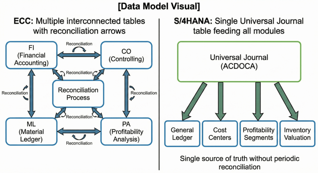 SAP ECC to S/4HANAĀ consolidates intoĀ ACDOCAāone line-item table for everything. Single transaction entry populates